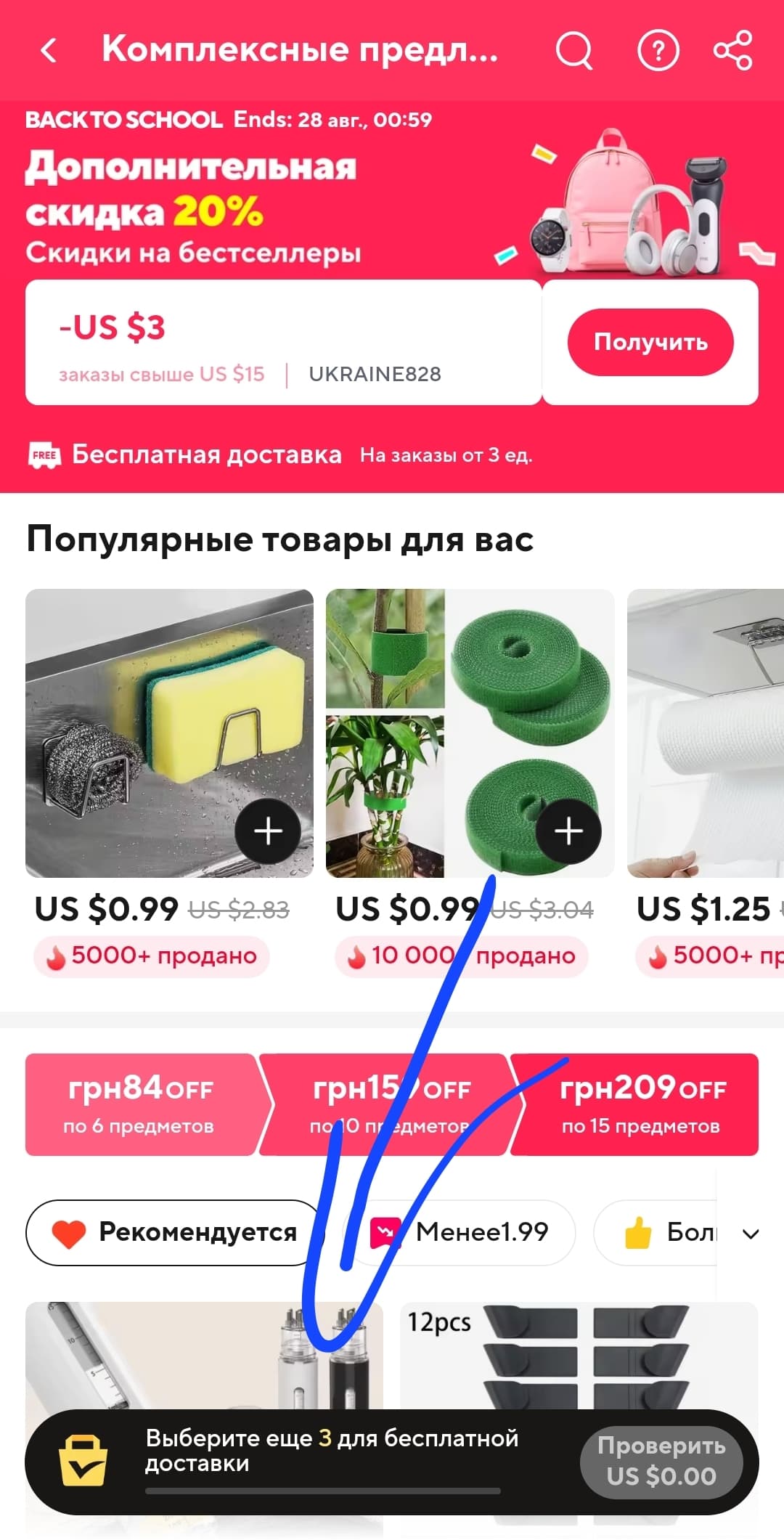 Там вообще выбрал 3 на бесплатную доставку, потом говорит выбери еще 3 и получи 2 бакса скидку, потом еще 3 и еще 4 бакса…