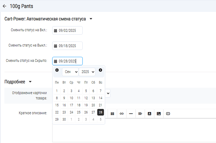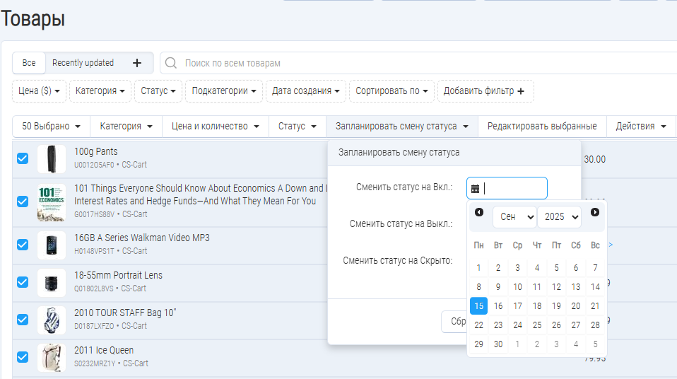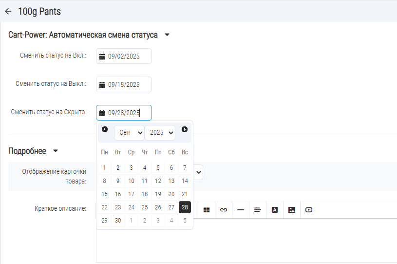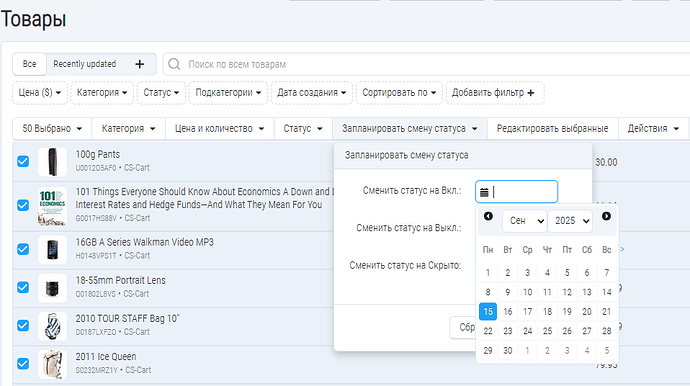 Больше не нужно помнить о необходимости включить или выключить товар, достаточно установить планируемую дату смены статуса и система сделает всё сама.