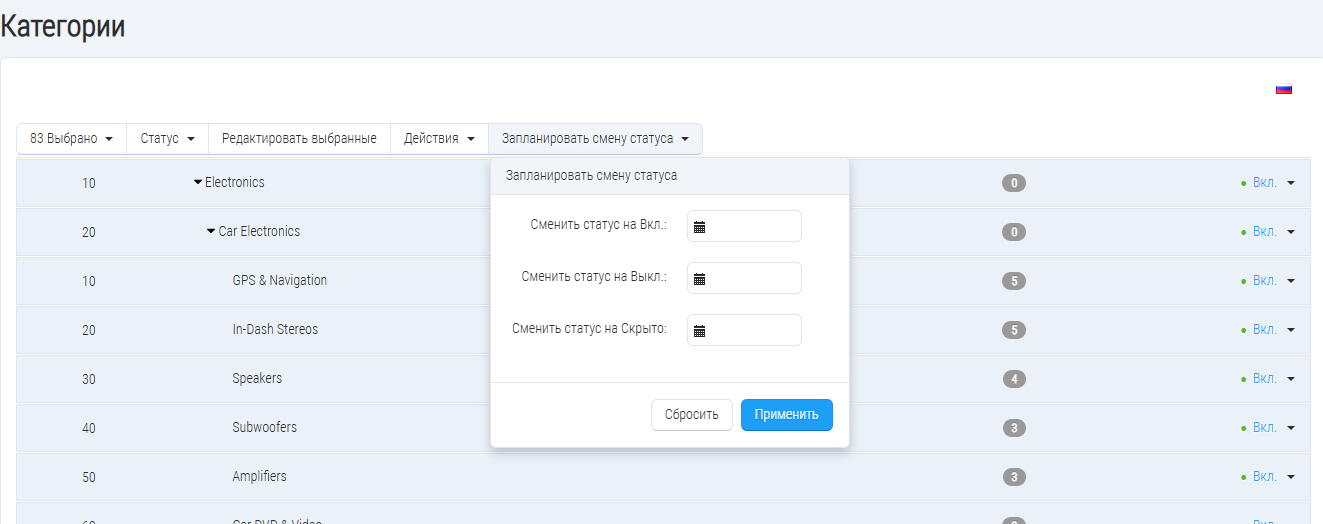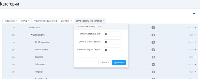Устанавливайте даты смены статуса для сотен товаров или категорий разом.