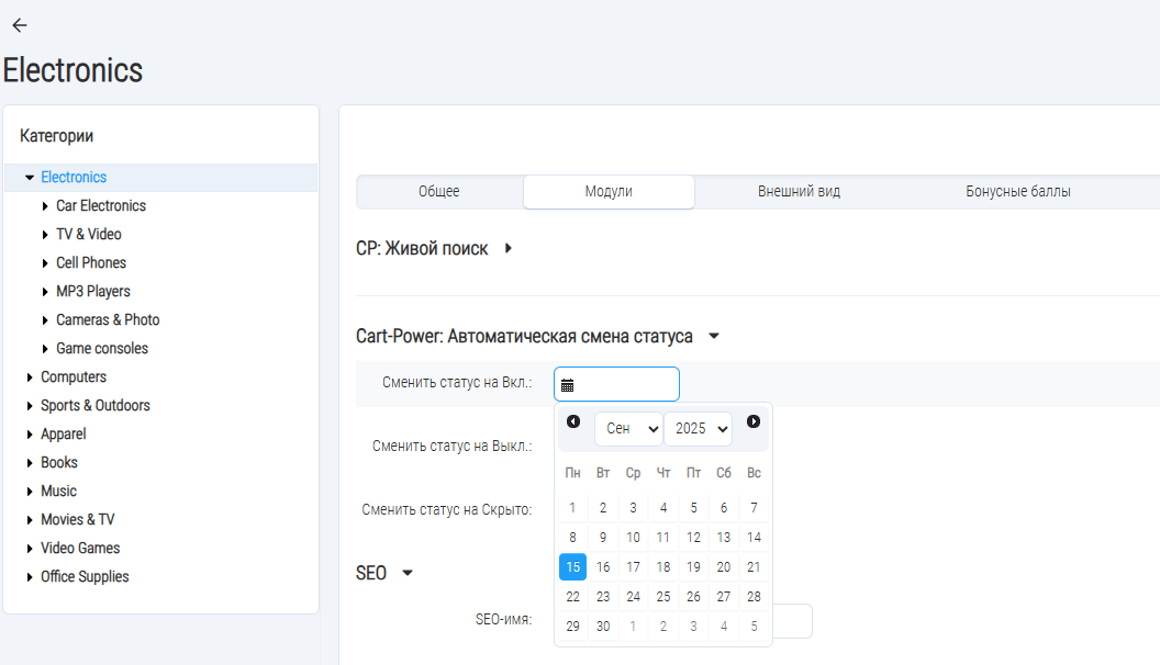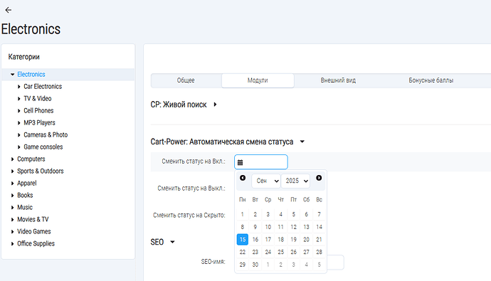 Модуль автоматически меняет статус товаров или категорий («Вкл.», «Выкл.», «Скрыто») в точно указанные вами даты. Идеальное решение для акций, предзаказов, сезонных товаров и управления видимостью разделов каталога без вашего участия.