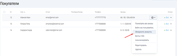 Объединяйте любые учетные записи покупателей прямо из панели администратора — из списка пользователей или страницы профиля. Просто выберите «главный» аккаунт и добавьте к нему нужные профили.