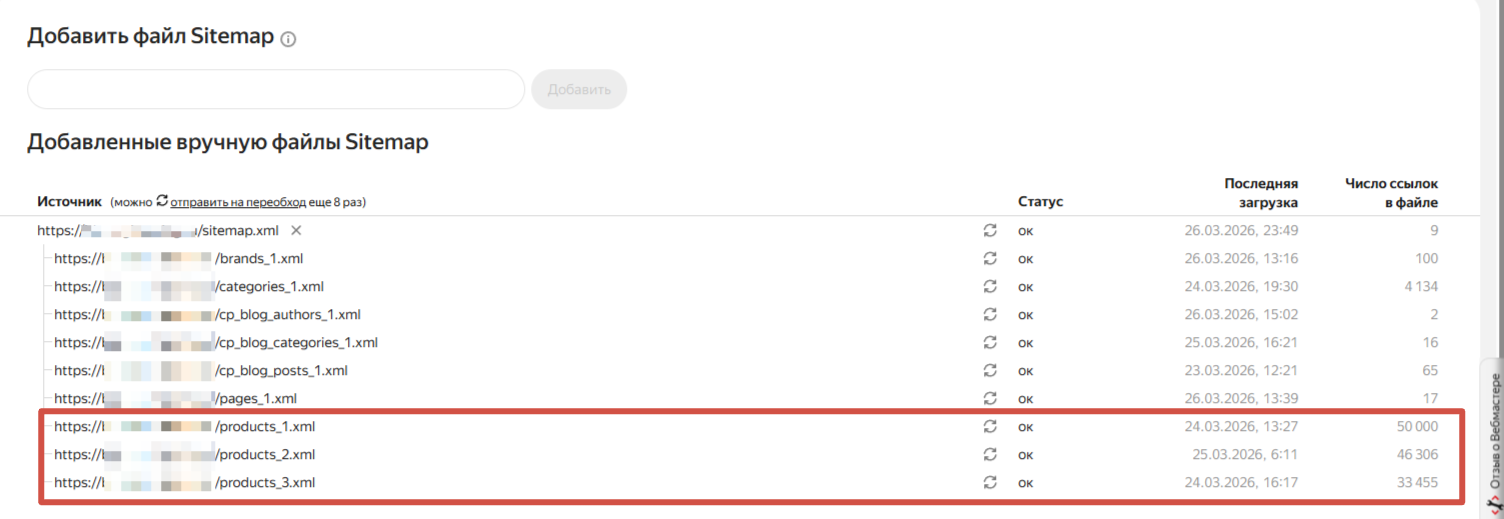 Столкнулись с проблемой, что Google не может скачать разбитые по 50.000 товаров товарные сайтмапы. Просьба доработать модуль, чтобы можно было указывать количество ссылок в одном фрагменте сайтмапа. Мы бы выставили там 10.000 ссылок