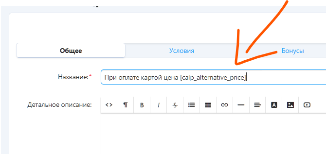 вывод Альтернативной цены в карточку товара или скорее будет лучше переменную в название Промоакций. Скрин 1