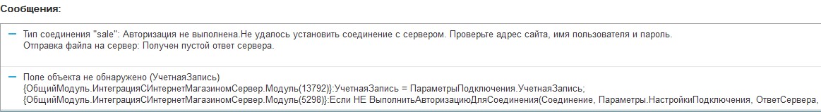 Конкретно проблема при выгрузке заказов из сайта, пишет какая-то ошибка соединения тип sale, ошибка авторизации.