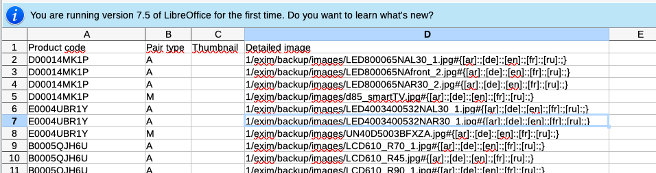 Артикул; URL картинки; тип загрузки (основная или дополнительная, A / M)
