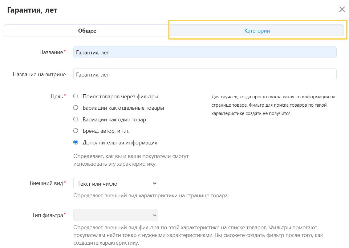 Если у характеристики категория не выбрана (Все категории), то вкладка выбора присутствует и можно выбрать конкретные категории (см.скрин 1)