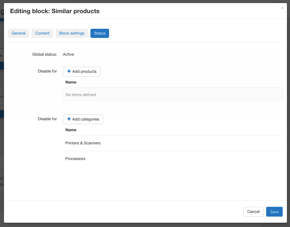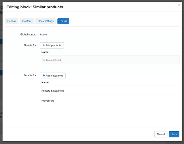 Сейчас, если вы хотите добавить/скрыть блок или вкладку для товаров из определенной категории, то вам нужно либо зайти в карточку каждого товара и включить блок/вкладку для товара, либо указать все необходимые товары в настройках блока.