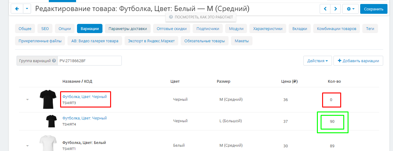 - Тут есть известный баг — вариация не меняется, если количество уменьшено до нуля импортом. Исправление этого бага войдёт в 4.10.4.