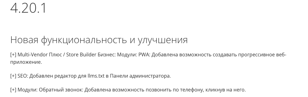 сворачиваемое меню и улучшения панели управления администратора для маленьких экранов защита от непреднамеренного удаления характеристик у товаров PWA-приложение и поддержка llms.txt для ИИ-поиска обновления оплат, TinyMCE, Nova Theme и другие улучшения