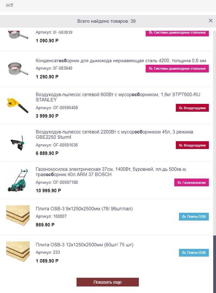 И там и там вокруг слова в запросе в наименованиях товара присутствуют другие слова. То есть “Ель заснеженная”, “Гантель резиновая”.
